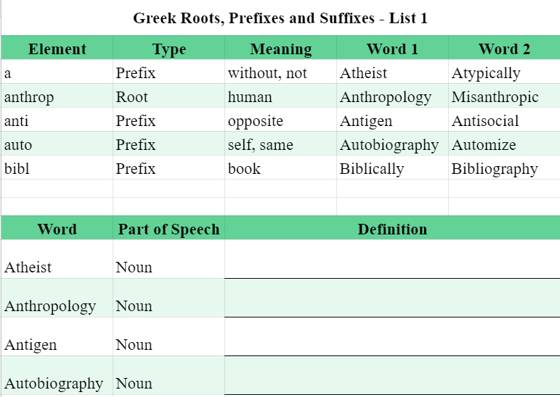 Greek Affixes/Roots of English Words: Vocab and Worksheets - 40 Roots, 8